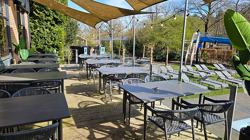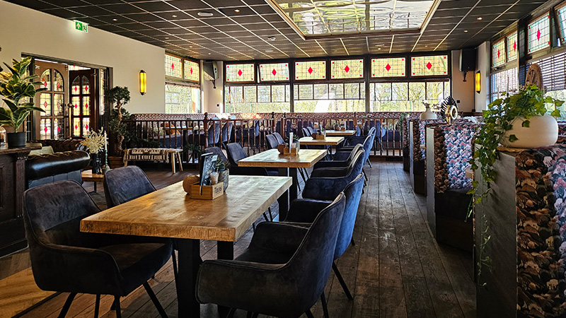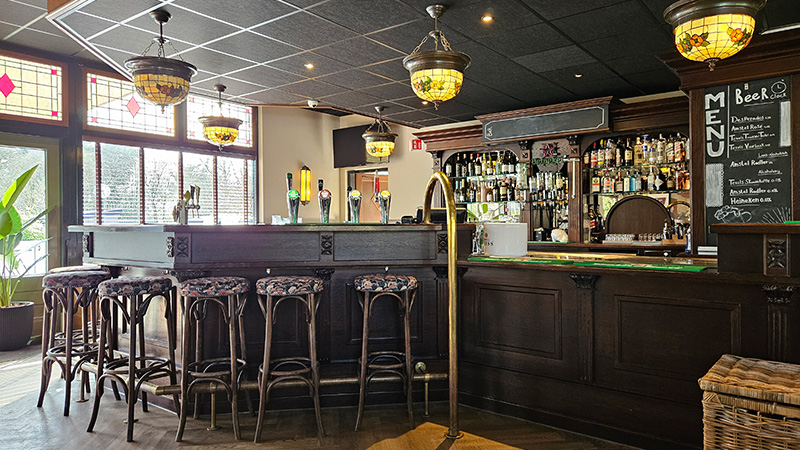 Het eetcafé heeft een grote bar, een biljarttafel en een fijn terras.