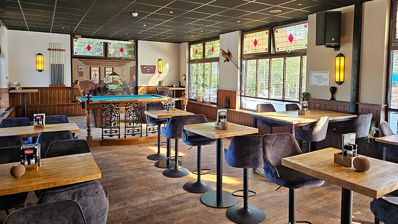 Het eetcafé heeft een grote bar, een biljarttafel en een fijn terras.